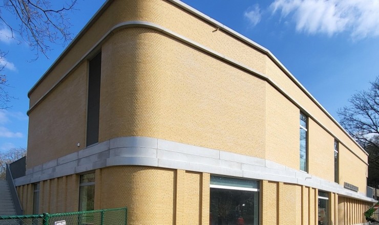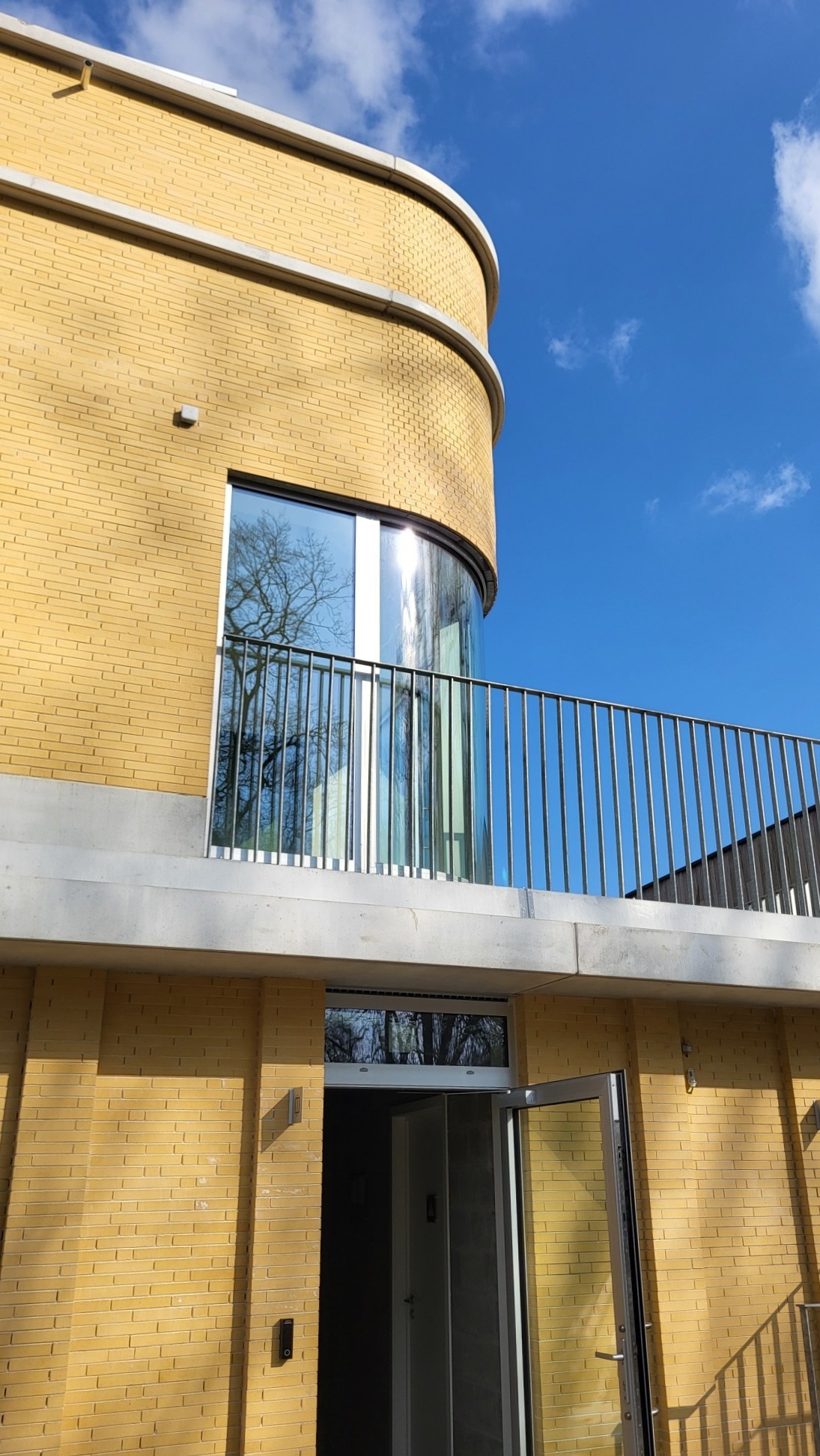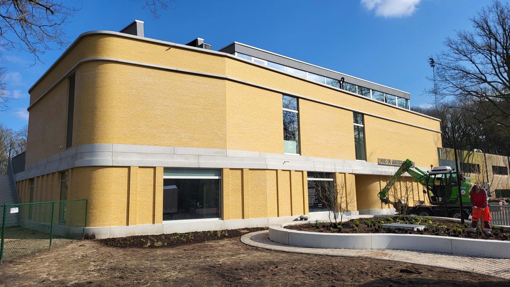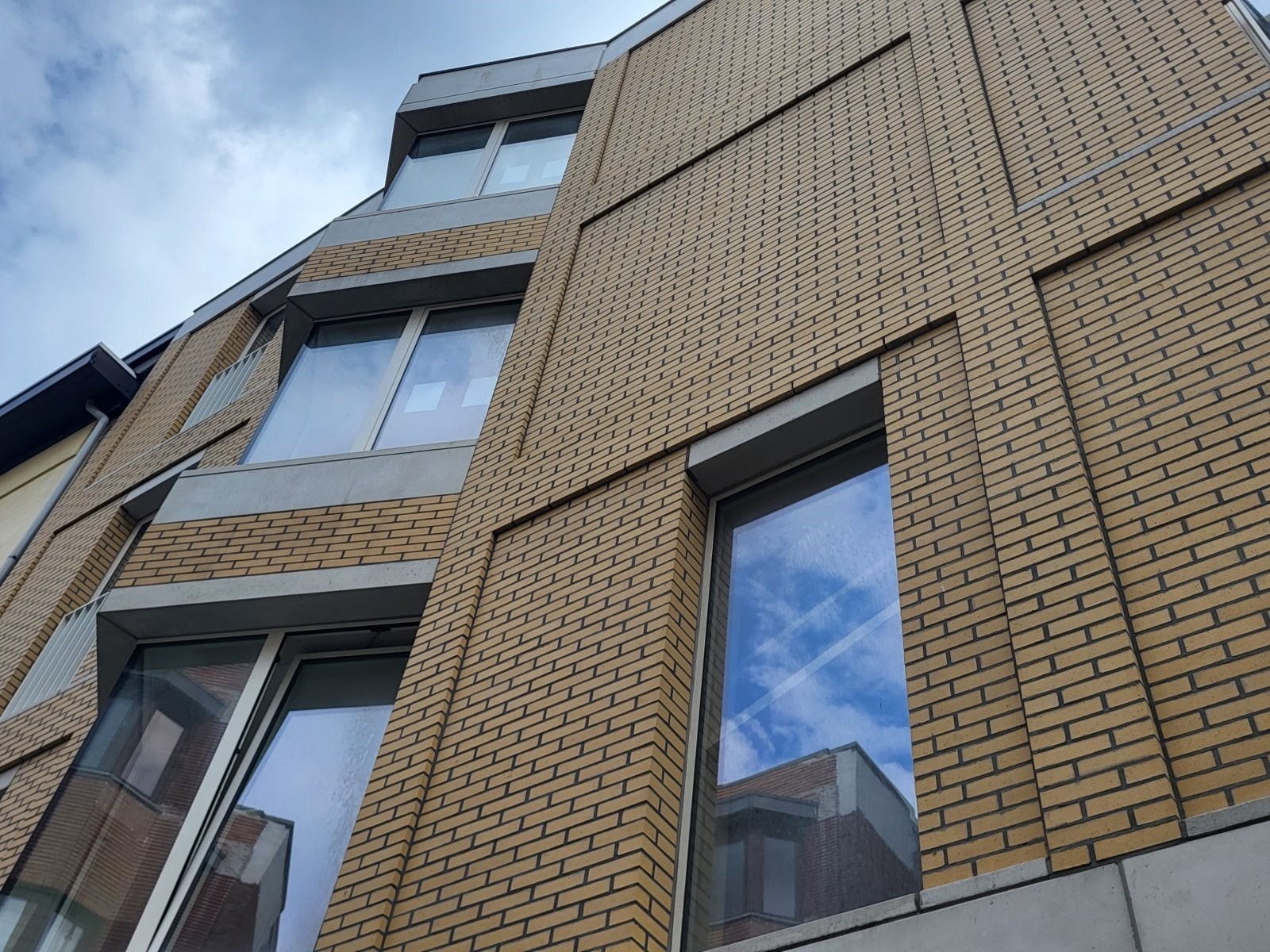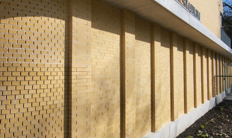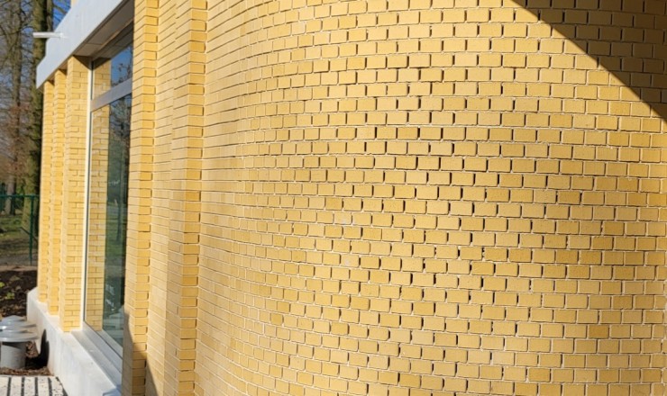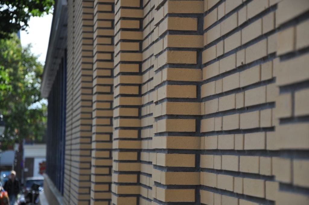 De gevelstenen zijn zachtgeel, in de massa gekleurd, met lichte onregelmatigheden.