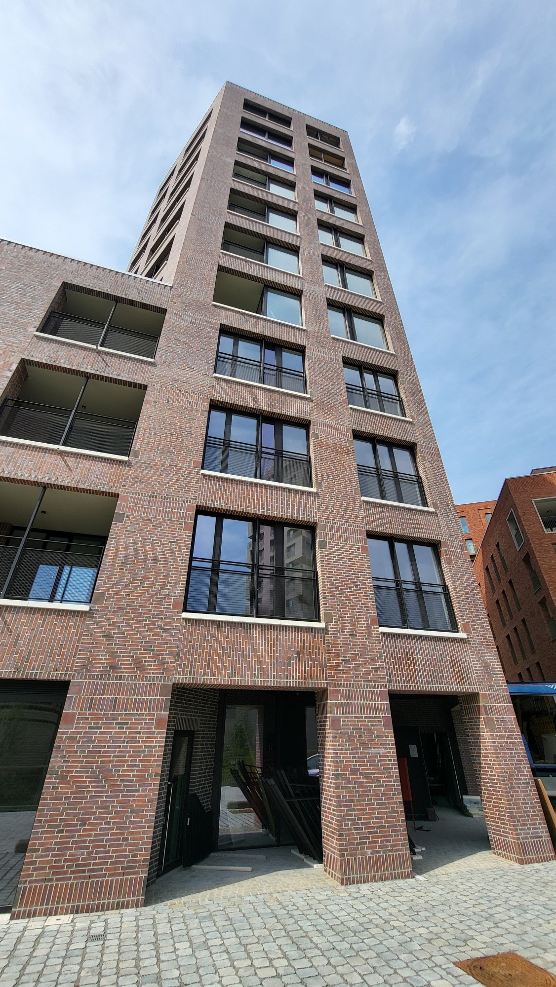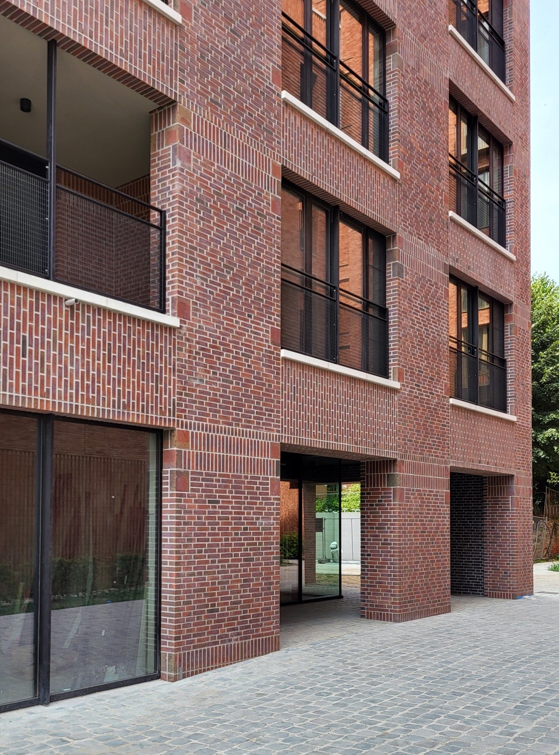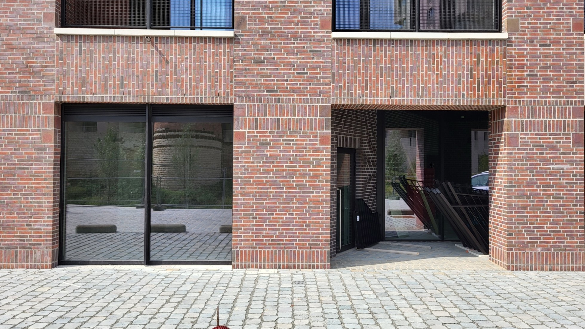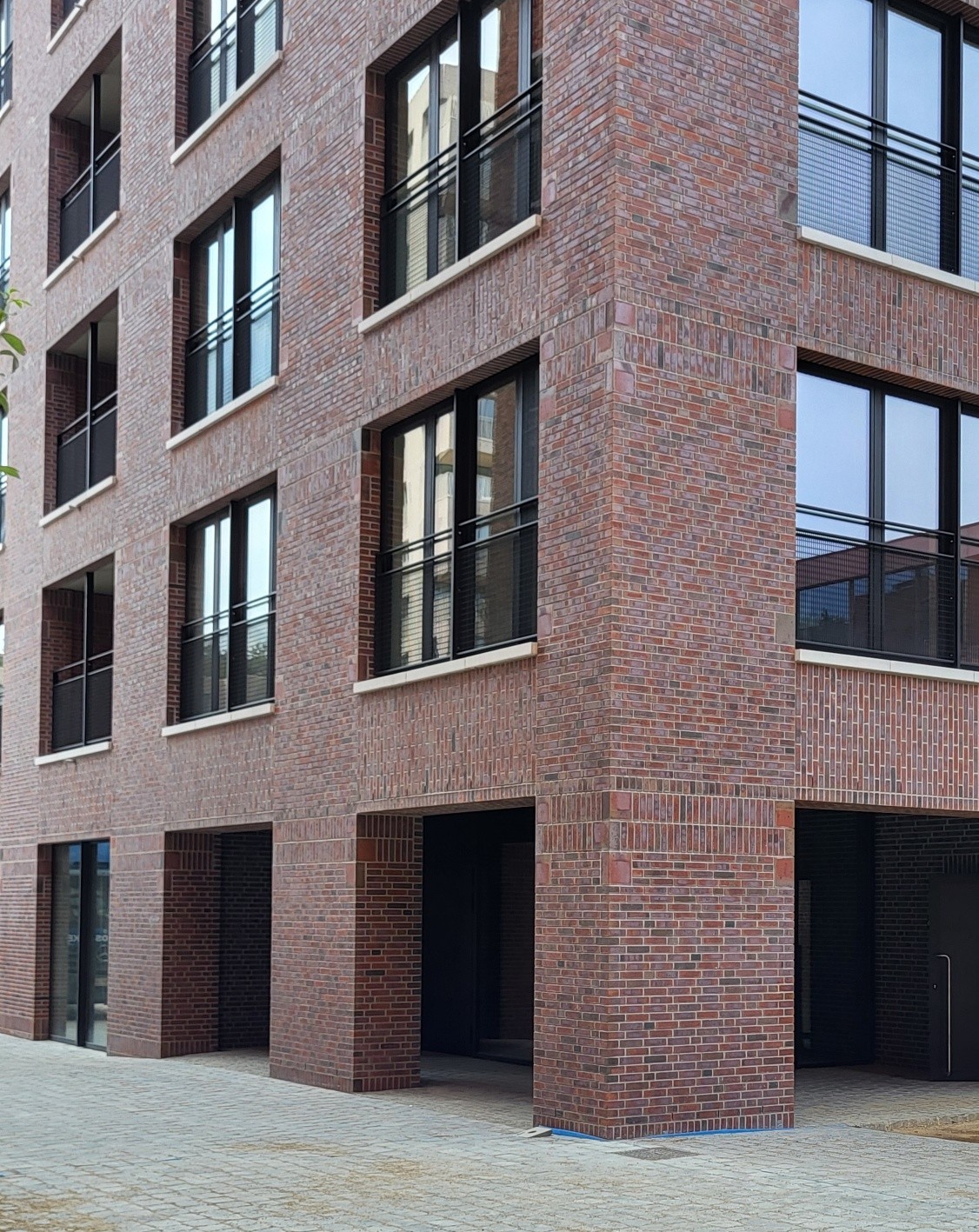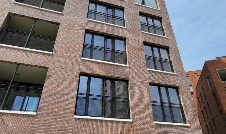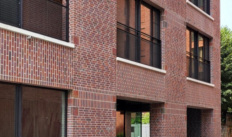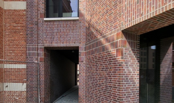 De gevelstenen zijn rood met bronskleurige, groengrijze, antracietgrijze en paarse nuanceringen, in de massa gekleurd.